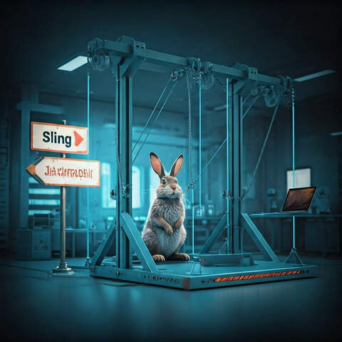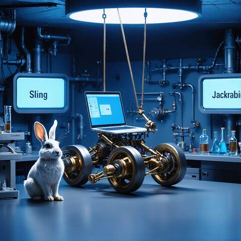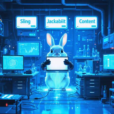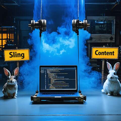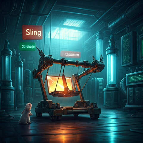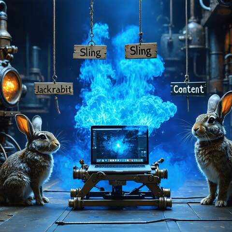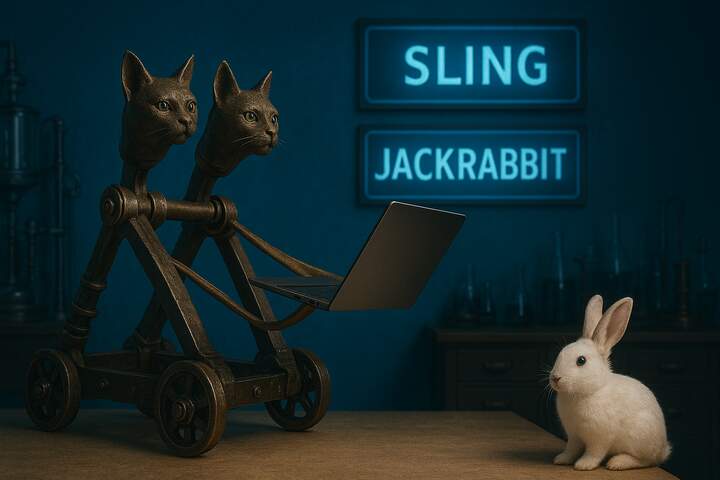 Create a humorous, 16x9 image of a two-headed sling catapult launching a laptop in a laboratory setting. The artistic style is cyberpunk and "the matrix". A cute, white jackrabbit is present. Three signs are in the background with the words "Sling" "Jackrabbit" and "Content". The lighting has a dominant blue hue; the catapult and laptop are the primary focus.